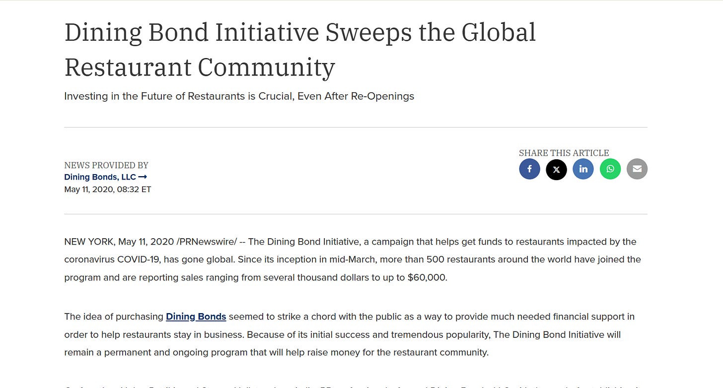 Another example is “The Dining Bond Initiative,” a campaign that helped get funds to restaurants impacted by COVID-19. During the pandemic, the program allowed people to support their favorite local restaurants by purchasing dining bonds.